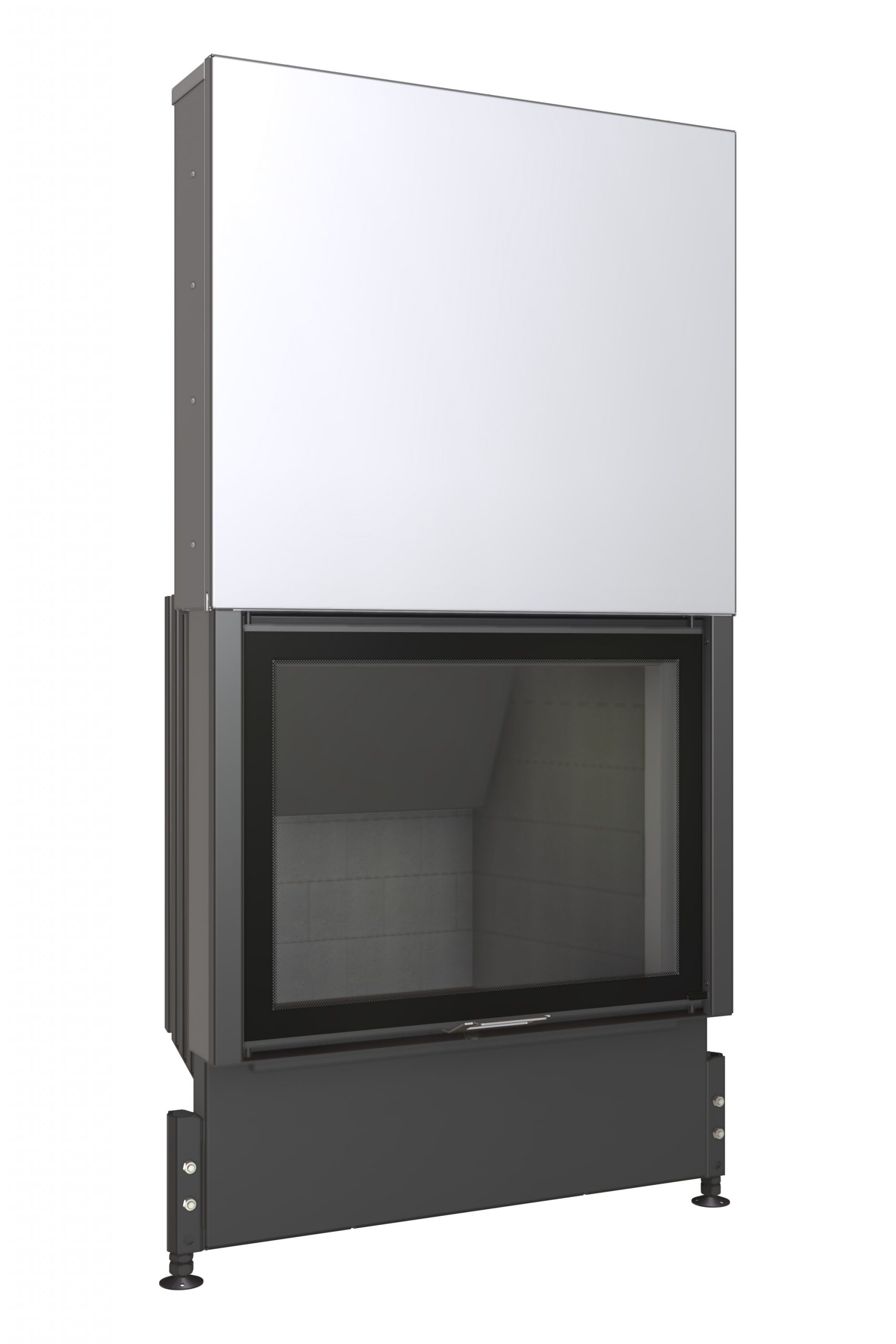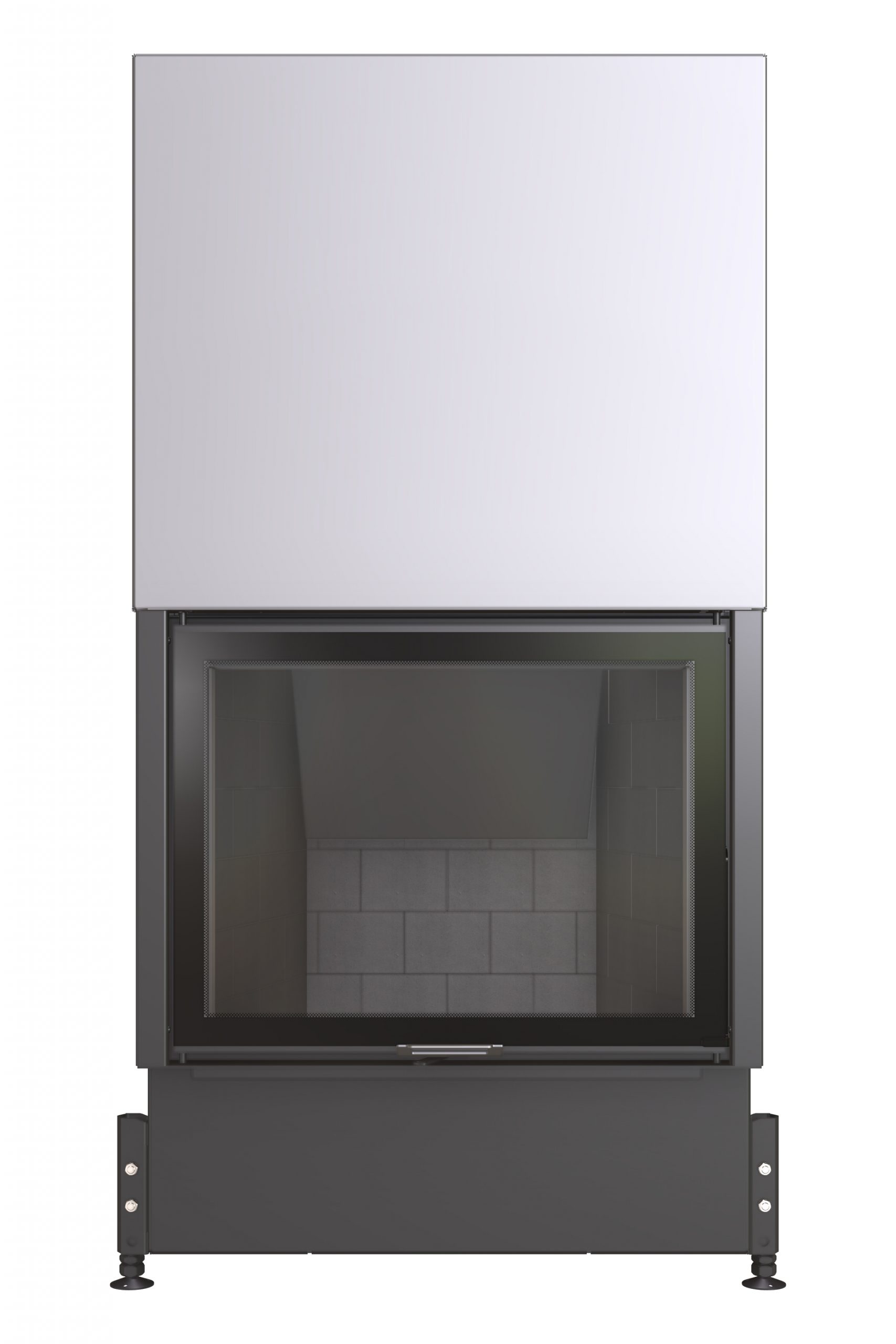 Foyer droit porte haute de 63 cm, en acier et brique réfractaire avec une porte relevable.