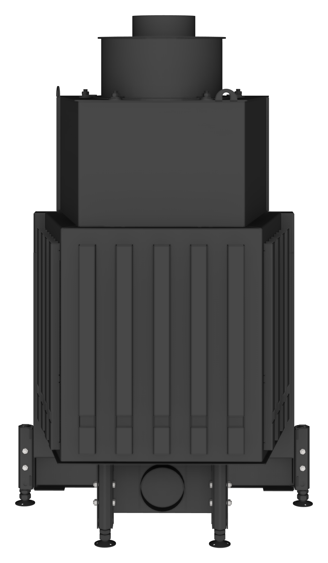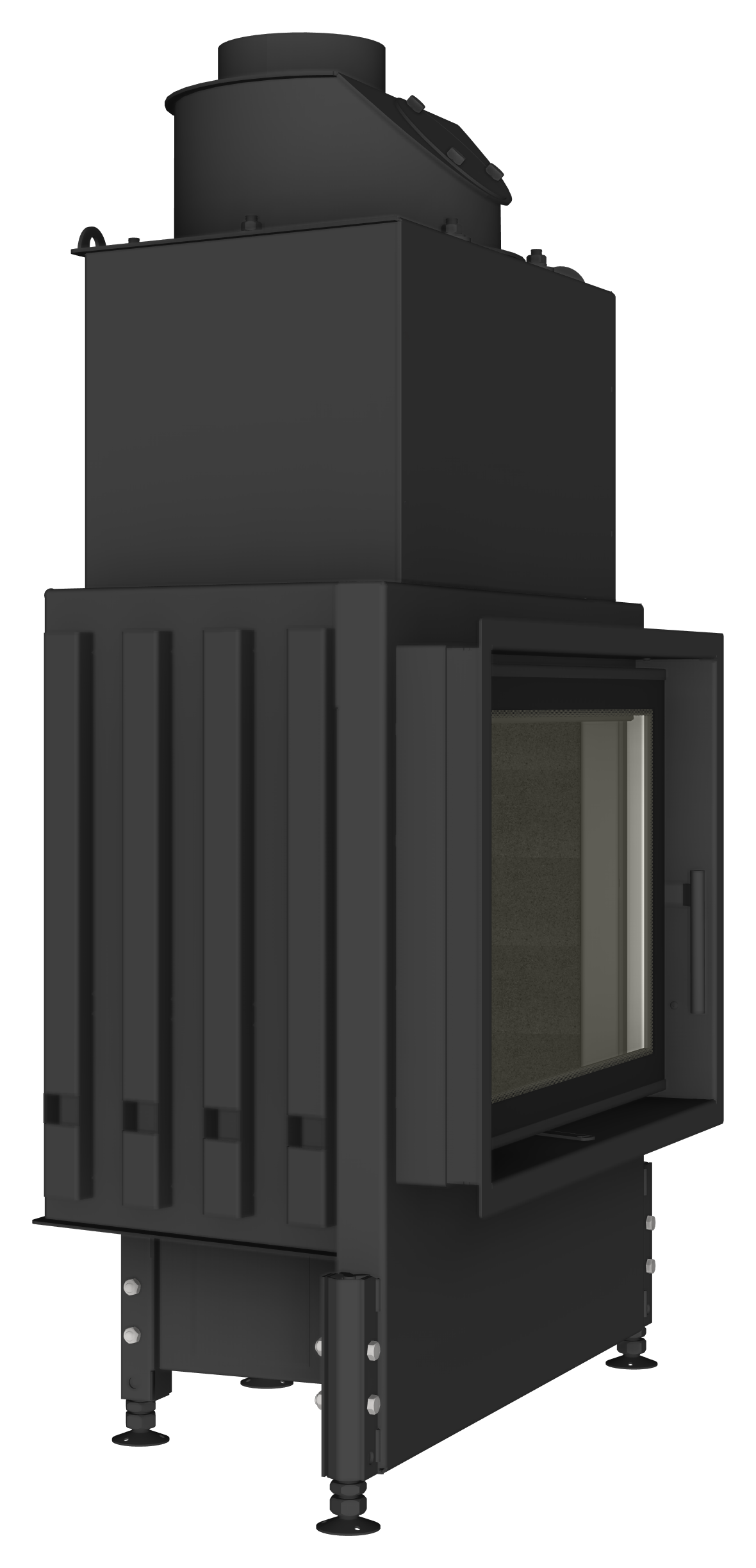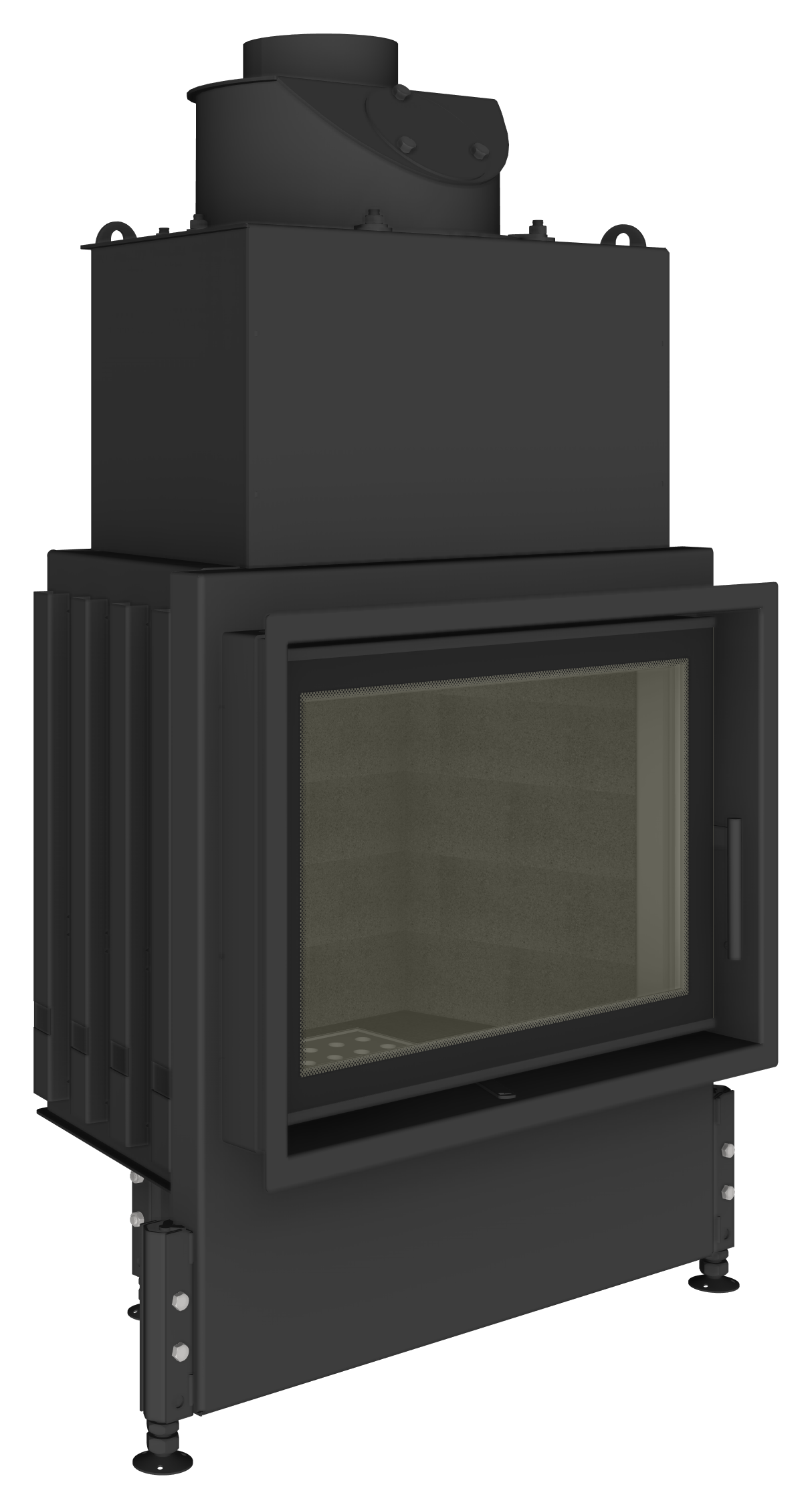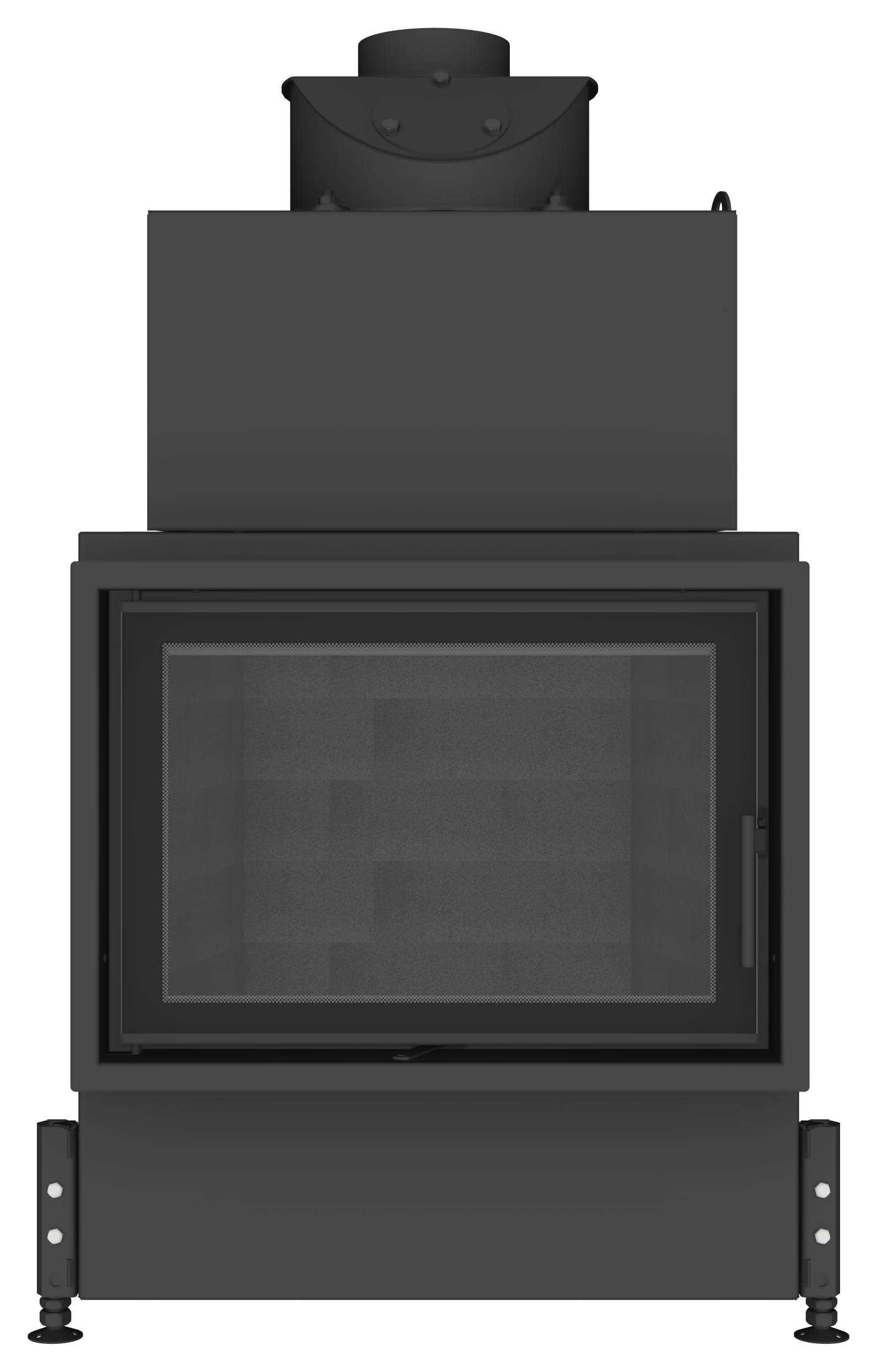Foyer droit de 73 cm de large, en acier et brique réfractaire avec une porte à ouverture latérale.